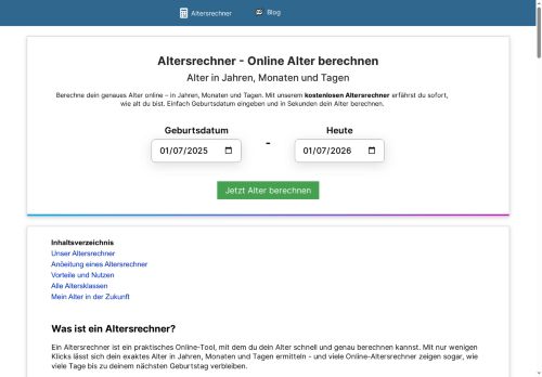 Mit dem Altersrechner von arbeitszeitrechner-24.de lässt sich das genaue Alter schnell und unkompliziert berechnen. Ob für private Zwecke, den Beruf oder offizielle Dokumente – der Altersrechner liefert präzise Ergebnisse auf Basis des Geburtsdatums. Dabei wird das Alter nicht nur in Jahren, sondern auf Wunsch auch in Monaten und Tagen ausgegeben.